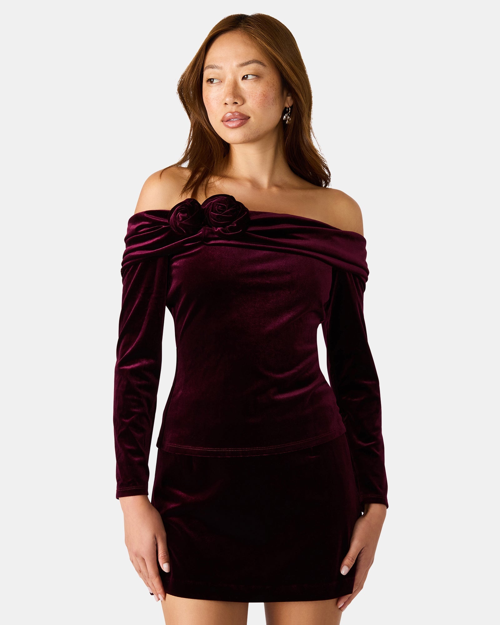 This LICI TOP WINE long-sleeved off-the-shoulder top features elegant rose decals that add a delicate, feminine touch. Its flattering neckline highlights the shoulders while the color lends a sophisticated warmth, making it a versatile piece for both casual and dressier occasions. The carefully tailored fit ensures comfort without compromising style.